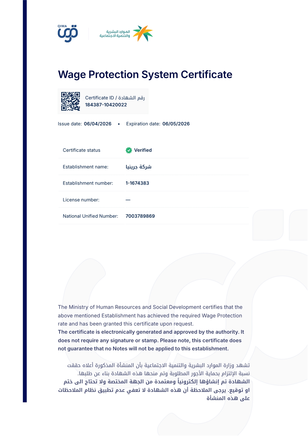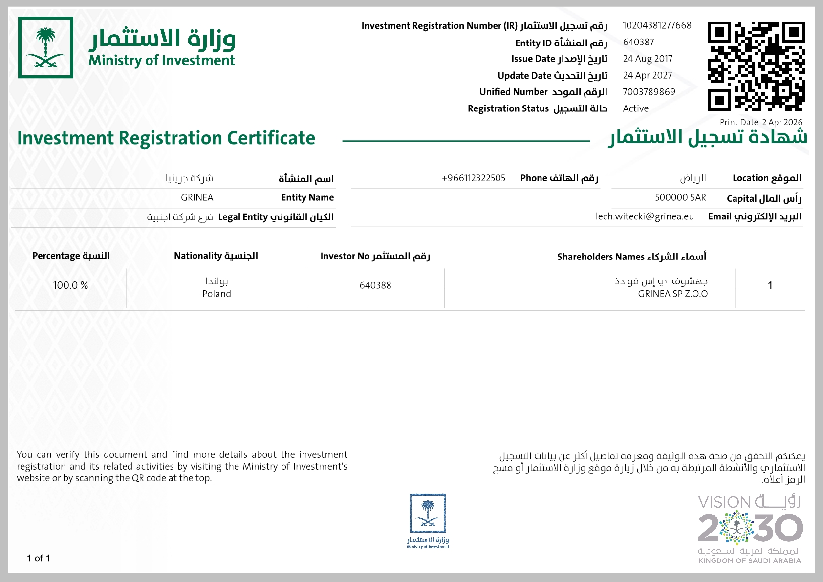 وقد تم تسجيل فرعنا بالكامل لدى الجهات الرسمية والوزارات السعودية، وهي وزارة الاستثمار ووزارة التجارة ووزارة الموارد البشرية والتنمية الاجتماعية ، وكذلك المؤسسة العامة للتأمينات الاجتماعية وهيئة الزكاة والضريبة والجمارك.