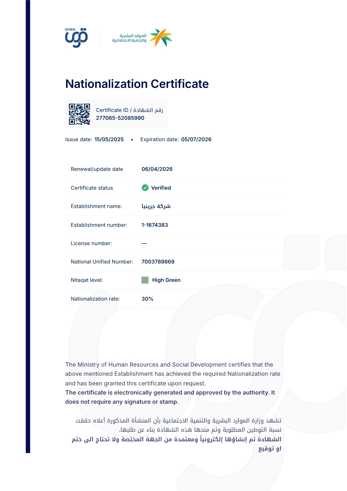 كما أصبح فرع جرينيا عضو في الغرفة التجارية الصناعية بالرياض والهيئة السعودية للمقاولين.