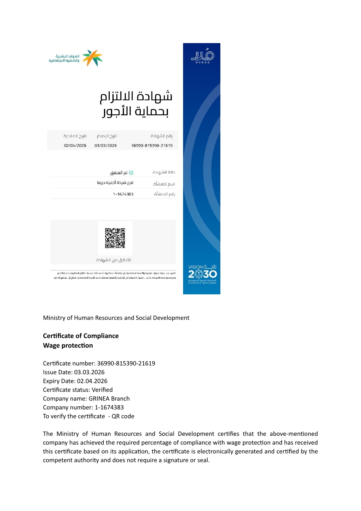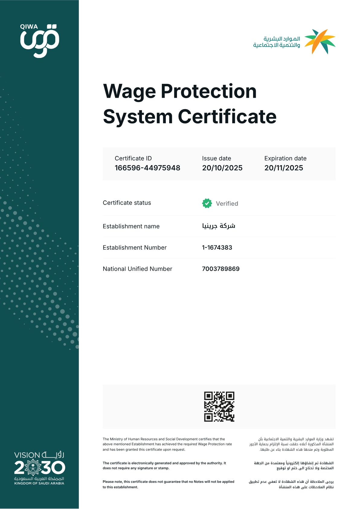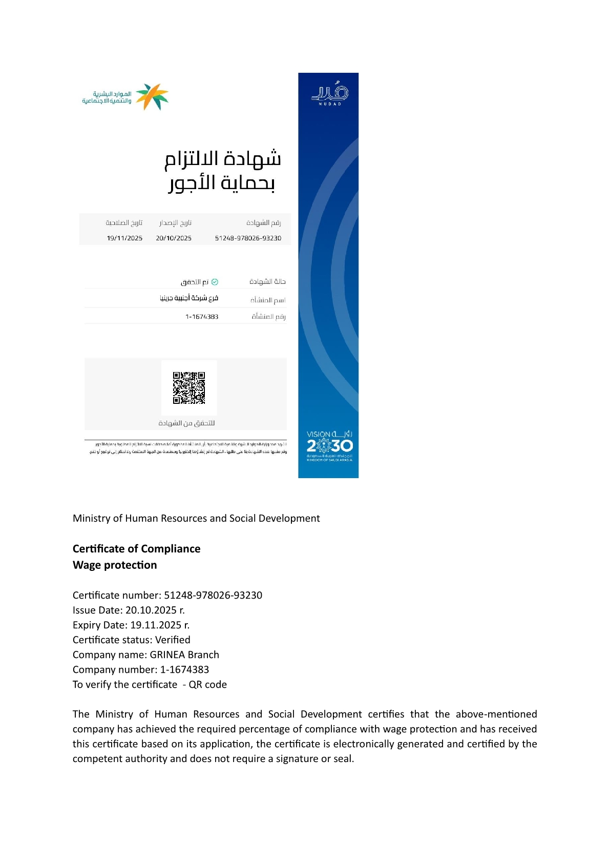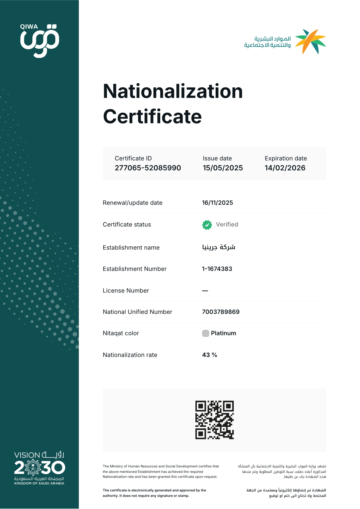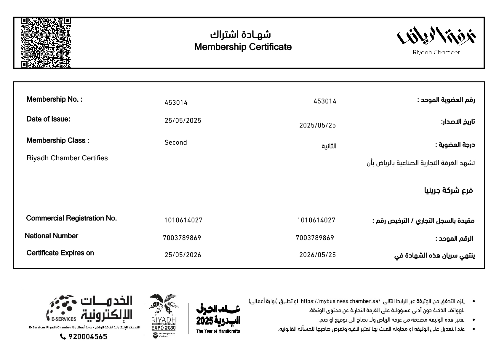 The branch was registered in Saudi institutions and ministries, i.e. Ministry of Investment, Ministry of Commerce, Ministry of Human Resources and Social Development, as well as GOSI and ZATCA. GRINEA is a member of the Riyadh Chamber of Commerce and Industry and has a member certificate from Saudi Contractors Authority.