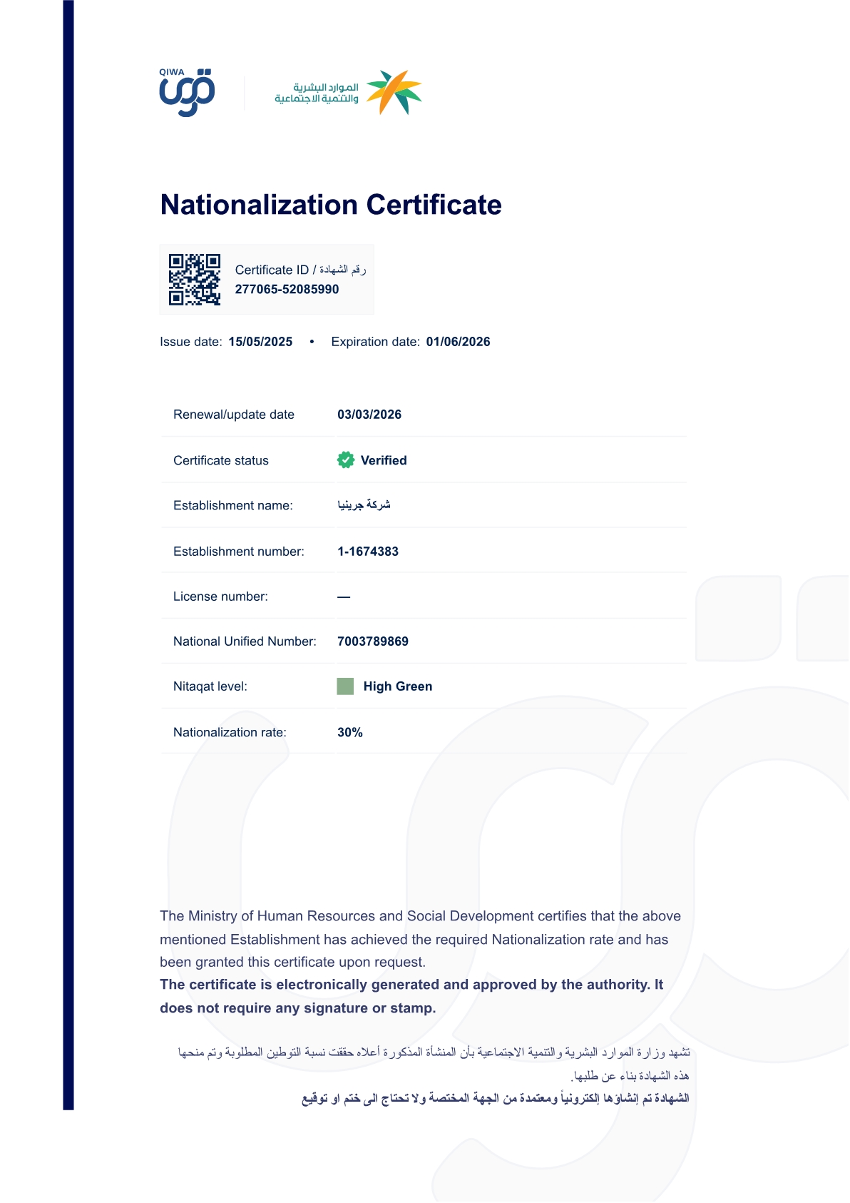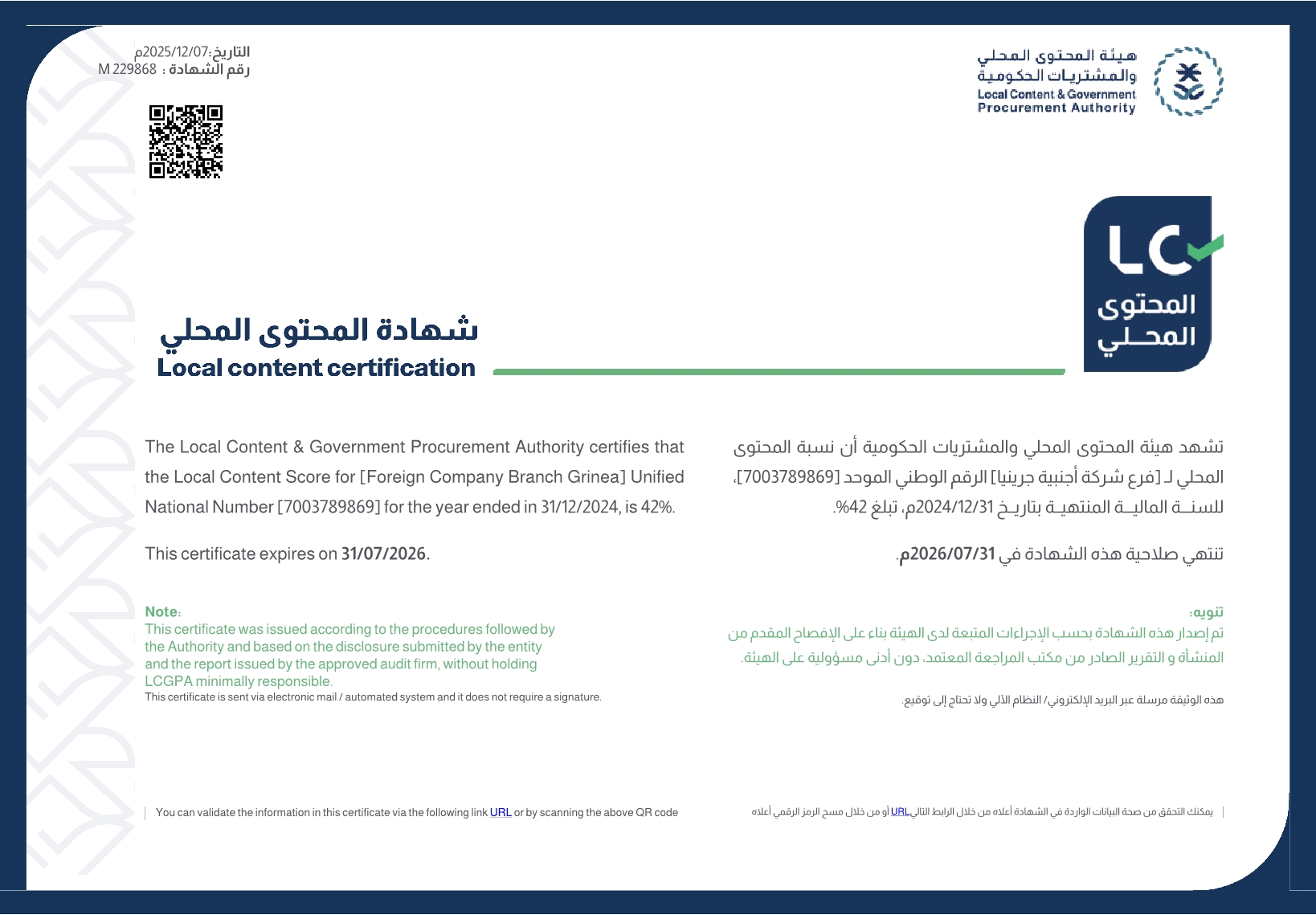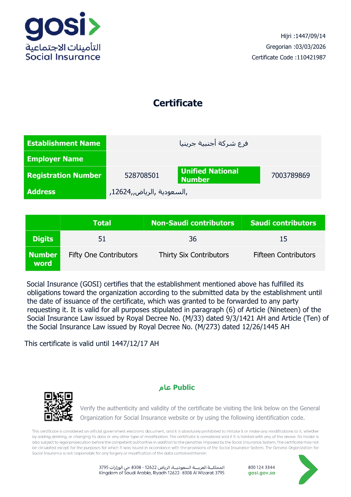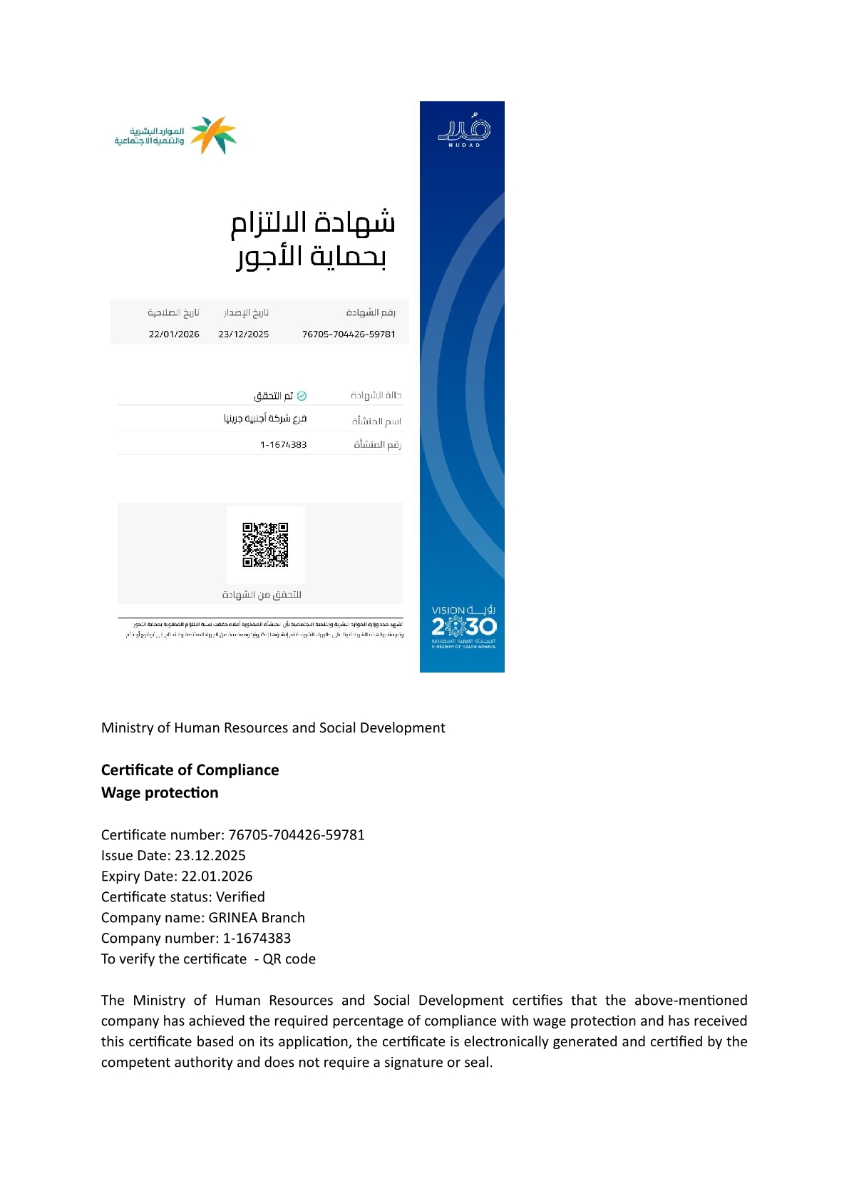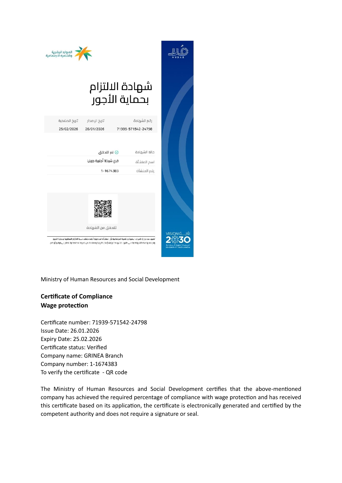 The branch was registered in Saudi institutions and ministries, i.e. Ministry of Investment, Ministry of Commerce, Ministry of Human Resources and Social Development, as well as GOSI and ZATCA. GRINEA is a member of the Riyadh Chamber of Commerce and Industry and has a member certificate from Saudi Contractors Authority.